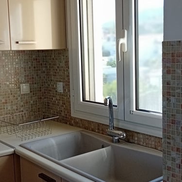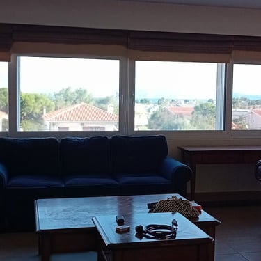 הדירה מוארת עם חלונות גדולים שמשקיפים לנוף הרים וים.